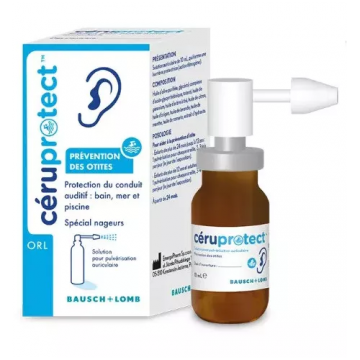 Solution pour pulvérisation auriculaire. Spécial nageurs. Céruprotect de BAUSCH & LOMB permet de protéger les oreilles contre de nombreux facteurs environnementaux. C'est une solution auriculaire qui hydrate et apaise le conduit auditif. Elle aide à prévenir les otites, atténue le gonflement du conduit auditif et maintient une humidité optimale. Céruprotect convient aux adultes, mais aussi aux enfants à partir de 24 mois.