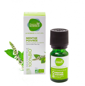 Cette huile essentielle de Menthe Poivrée 100% bio, pure et naturelle est obtenue par distillation à la vapeur d'eau. Flacon de 10ml. - Conseils d'utilisation: Ne pas avaler l'huile essentielle pure. Déposer 1 à 2 gouttes sur un morceau de sucre ou un comprimé neutre ou les mélanger à une cuillérée à café de miel ou d'huile d'olive. Ne pas verser directement dans de l'eau, du thé ou une tisane. - Ingrédients: Pour une dose journalière recommandée de 2 gouttes. Huile essentielle de menthe poivrée 0,08ml. Ingrédient issu de l'agriculture biologique. Certifié par ECOCERT