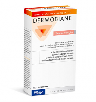 Pileje Dermobiane Cheveux et Ongles c"est un complément alimentaire qui permet de redonner santé et beauté aux ongles et à la chevelure. Ces gélules sont composées de : cystéine taurine zinc cuivre sélénium extraits de bambou vitamines B Le zinc et le sélénium contribuent au maintien d'ongles normaux. La biotine, le cuivre, le sélénium et le zinc contribuent au maintien de cheveux normaux.