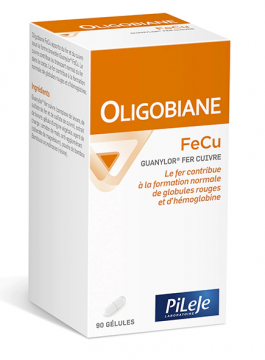 Le fer est un oligoélément essentiel au transport et au stockage de l’oxygène dans l’organisme. Le fer est en effet un constituant de l'hémoglobine contenue dans les globules rouges qui transportent l’oxygène des poumons vers les tissus. L’organisme humain adulte contient environ 4 g de fer. Une alimentation déséquilibrée ou une absorption réduite peuvent entrainer un déséquilibre en fer. Par ailleurs, les femmes sont plus susceptibles de présenter ce déséquilibre car leurs besoins en fer sont augmentés pendant les pertes menstruelles ainsi qu’au cours d’une grossesse. Oligobiane FeCu apporte : 14mg de fer, soit 100% des VNR* qui contribue : à la formation normale des globules rouges et de l'hémoglobine. au transport normal de l'oxygène dans l'organisme. à réduire la fatigue 500 µg de cuivre qui contribue au transport normal du fer dans le corps. À base de : Guanylor fer cuivre