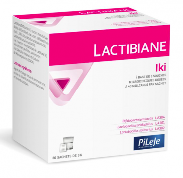 Lactibiane Iki est un complément alimentaire, en sachet de 3 grammes, à base de 3 souches microbiotiques, Bifidobacterium lactis LA304, Lactibacillus acidophilus LA201, Lactobacillus salivarius LA302, contribue à rééquilibrer la flore intestinale et lutter contre les troubles digestifs conséquents. Lactibiane Référence, mélange de microbiotiques qui permet de retrouver un confort digestif et un bon équilibre de la flore intestinale. La flore intestinale ou microbiote est constituée de l’ensemble des micro-organismes (100 000 milliards) présents dans l’intestin, et joue un rôle essentiel dans le maintien de notre santé. Les souches microbiotiques de Lactibiane Iki, sélectionnées par PiLeJe, sont inscrites à la Collection Nationale de Cultures de Microorganismes (CNCM).