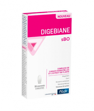 Mélisse, HE de Gingembre, HE de Carvi, HE de Romarin, Vitamine B2, Vitamine B12 Digebiane sBO complément alimentaire des Laboratoires Pileje, destiné à accompagner les personnes rencontrant des inconforts digestifs grâce à sa composition en vitamine B2. Contient notamment : De l’huile essentielle de Gingembre De l’huile essentielle de Carvi De l’huile essentielle de Romarin à Chémotype* verbénone De l’extrait de mélisse Des vitamines B2 et B12 La vitamine B2 contribue au maintien des muqueuses normales telles que les muqueuses digestives.