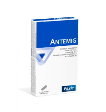 Antemig complément alimentaire des Laboratoires Pileje, à base d'oxyde de magnésium marin Hypro-ri®mag, coenzyme Q10, d'extrait de grande camomille et vitamine B6. Le magnésium utilisé dans la formule d'Antemig est obtenu exclusivement à partir d'eau de mer naturellement concentrée en sels minéraux. Il est présent notamment sous la forme spécifique Hypro-ri® mag. Cette forme associe oxyde de magnésium marin et hydrolysat de protéines de riz, ce qui optimise la fixation et la biodisponibilité du magnésium. La grande camomille est une plante vivace de la famille des astéracées qui pousse particulièrement en France. Elle est notamment constituée de parthénolide, un composé localisé dans les glandes situées sous les feuilles des plantes en croissance.