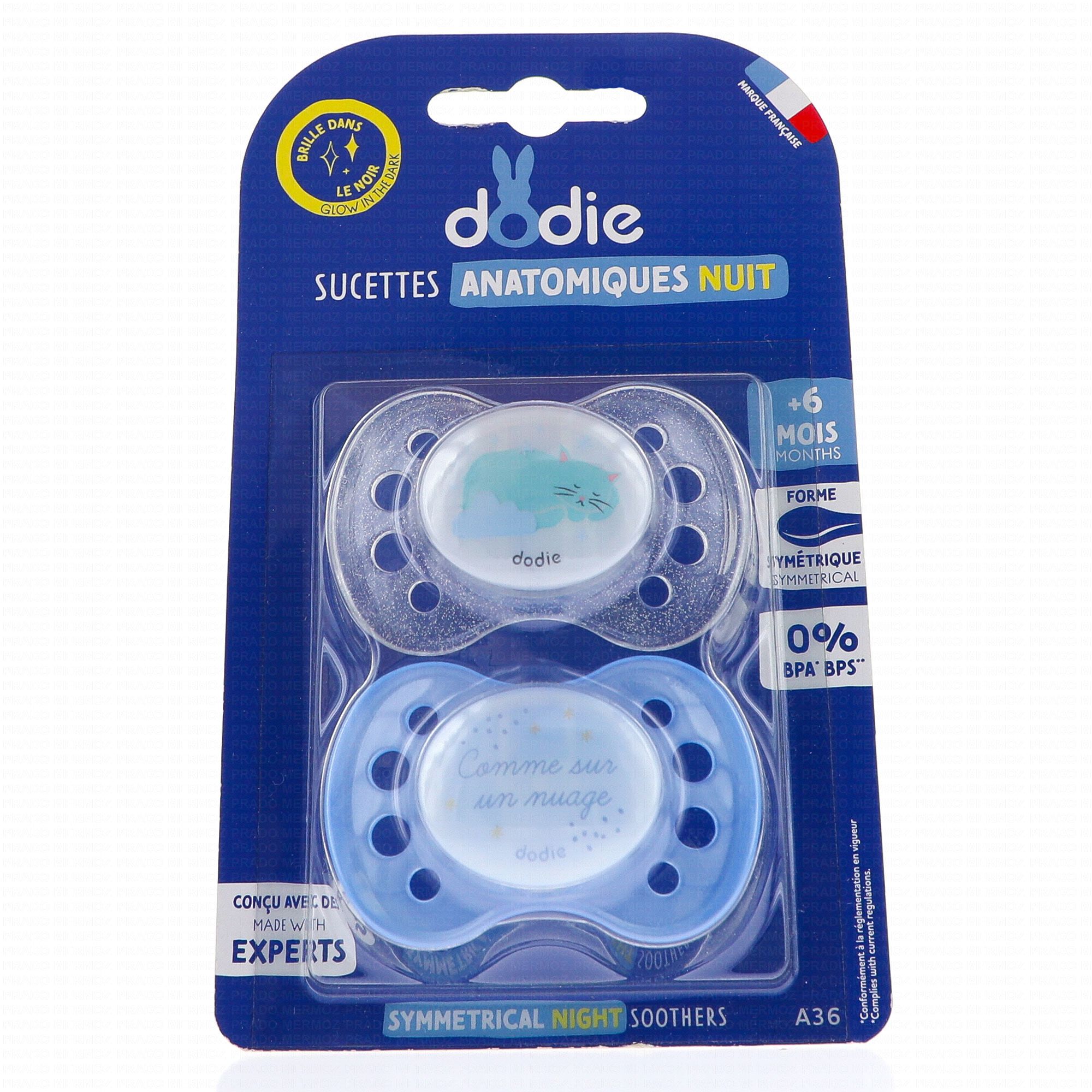 . Marque Dodie à Paris. Bouton phosphorescent qui brille pendant plusieurs heures pour retrouver facilement la sucette dans la nuit" />