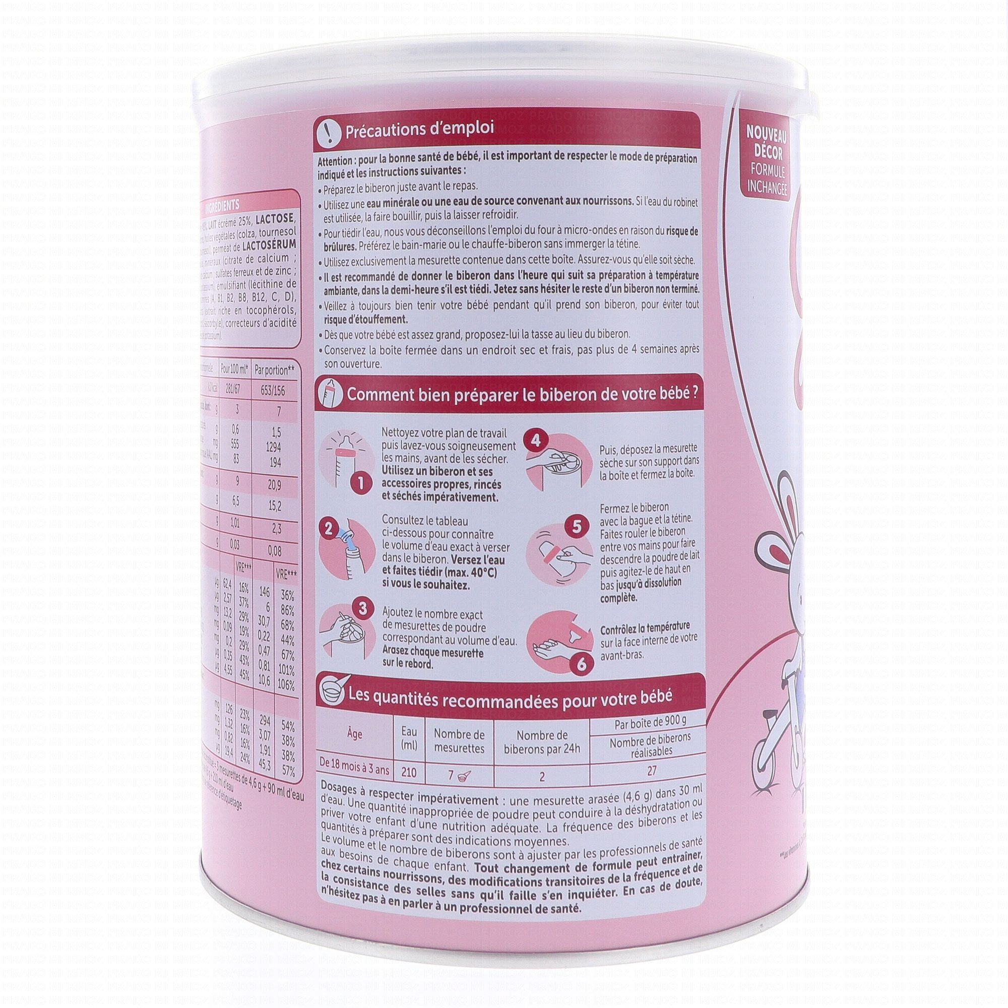 Laitentier,laitécrémé,lactose, huiles végétales (colza, tournesol riche en acide oléique, tournesol), perméat delactosérumdéminéralisé, carbonate de calcium, émulsifiant (lécithine de soja), correcteur d'acidité (phosphate de potassium, acide citrique), vitamines (C, riboflavine, A, D, B12), sulfates ferreux et de zinc, antioxydants (extrait riche en tocophérols, palmitate de L-ascorbyle, iodure de potassium).