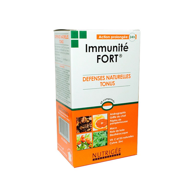 Extrait d'acérola concentré 19/1 (standardisé 25% de vitamine C naturelle). extrait d'andrographis concentré 20/1 (standardisé 10% d'andrographolides), extrait de griffe du chat concentré 4/1 (standardisé 3% d'alcaloïdes), extrait de pépins de pamplemousse concentré 4/1 (standardisé 45 % de flavonoldes), extrait de maca concentré 8/1, extrait de noix de kola concentré 2/1 (standardisé 10% de caféine naturelle). extrait d'éleuthérocoque concentré 10/1 (standardisé 1.4 % d'éleuthérosides), oxyde de zinc, sutfate de cuivre. extrait de lichen (vitamine D3 naturelle). Adjuvants de fabrication : cellulose, HPM Cellulose végétale. stearate de magnésium. dioxyde de silicium.